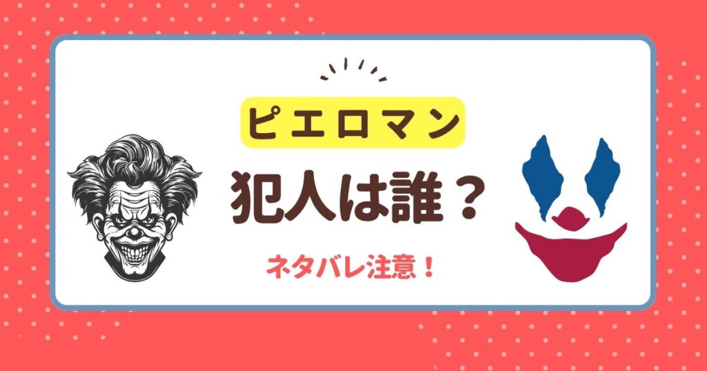 この記事では、漫画「ピエロマン」の犯人の名前と動機をまとめています。 最終巻までのネタバレになってしまうので、ネタバレを避けたい方はご注意くださいませ。 ピエロマンを全巻もしくは単巻で読むなら、→DMMブックスがかなりお得!今ならクーポンで全... -